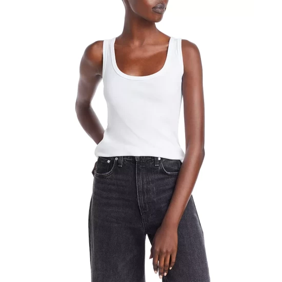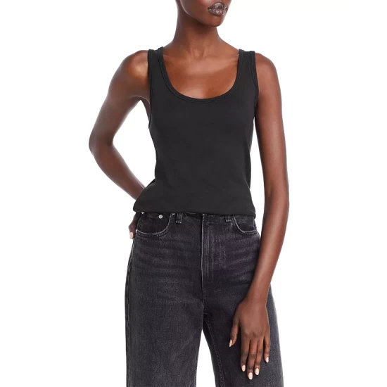 Ribbed tank with scooped neckline. Pulls on over head. Bra-friendly. Longer length.