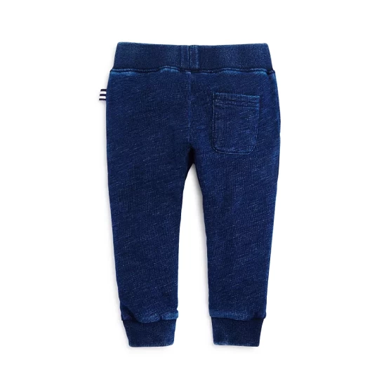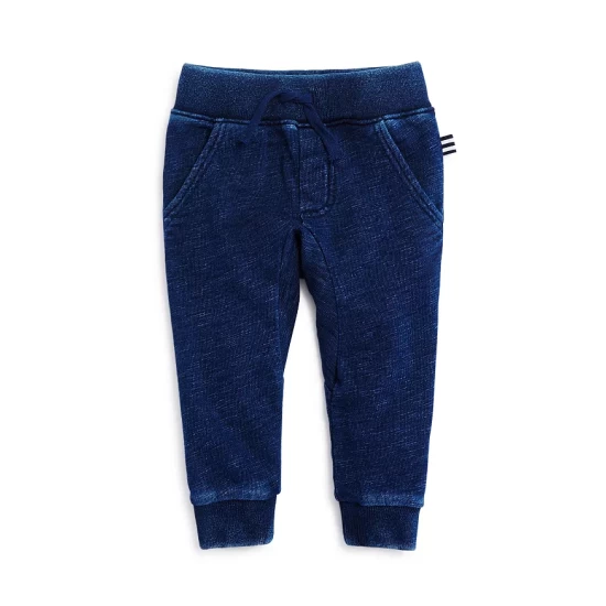 - Ribbed elasticized waist with tacked drawstring, angled front pockets, one back patch pocket, faux fly, ribbed cuffs